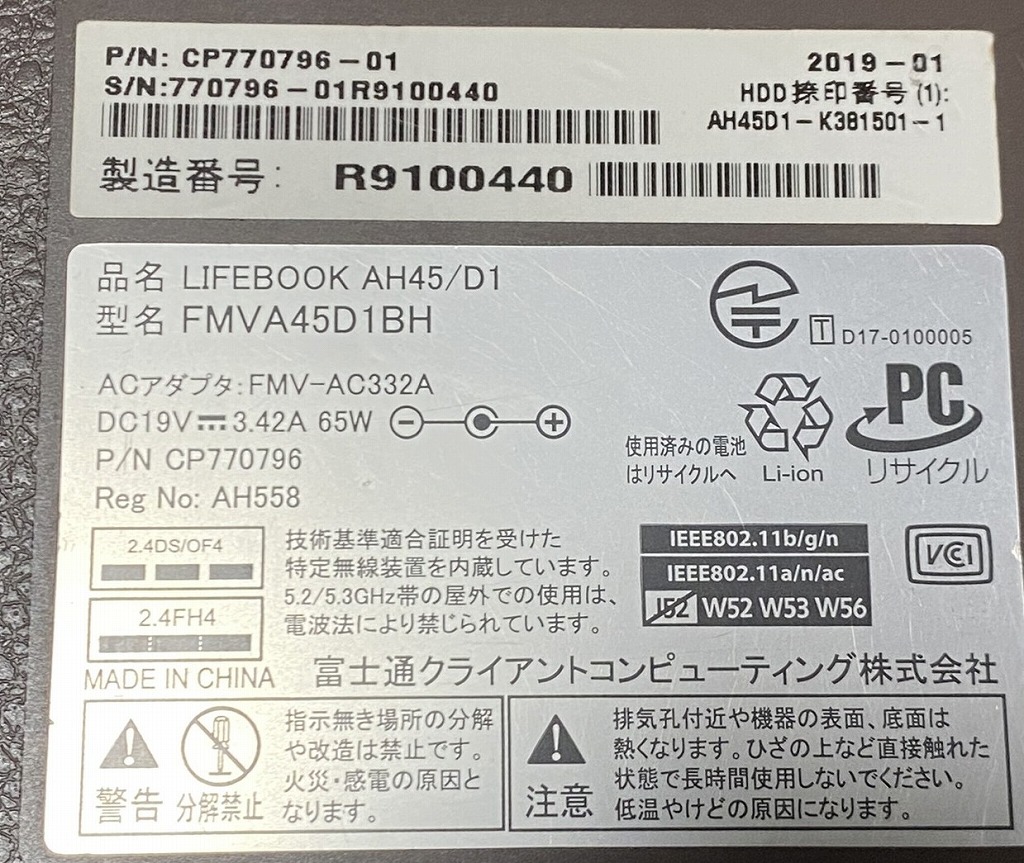 型番:富士通 FMV LIFEBOOK AH45/D1 ★2019年1月製造★
